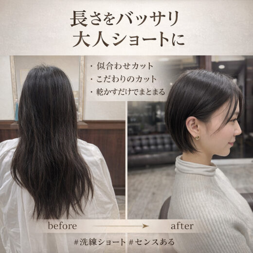 カットはメリハリをつけた女性らしさのあるフォルムのショートヘアに