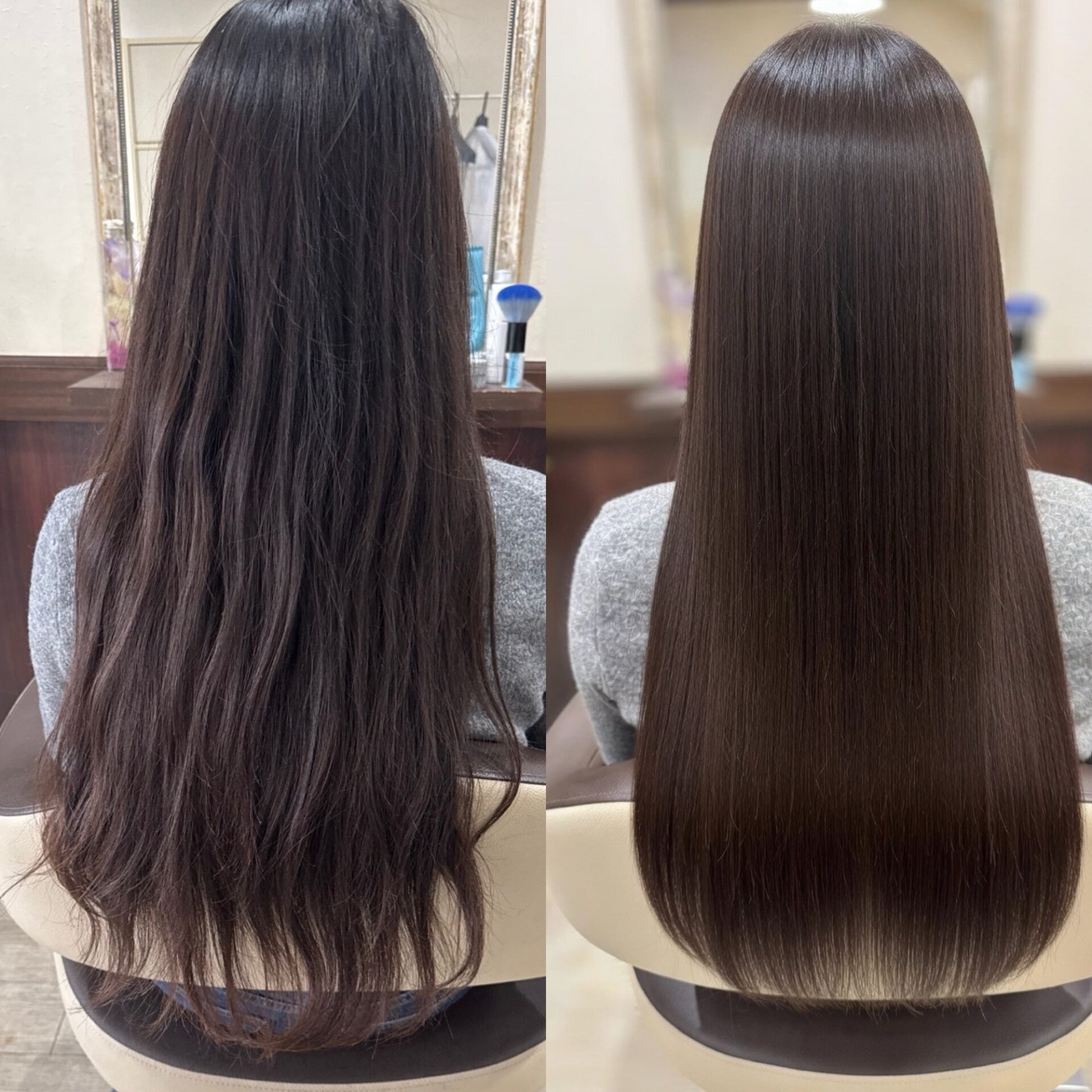 縮毛矯正と一言で言っても、場所によって薬剤のパワーを細かく調整するのがプロの技。毛先のダメージに配慮しながら、髪質改善トリートメントを併用することで、Afterのようなシルクのような艶が蘇りました!