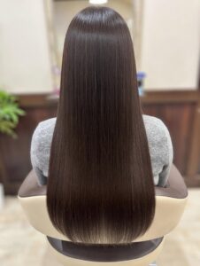 • 中間〜毛先: 残っていたデジタルパーマのウェーブを優しく落とし、指通りの良いストレートへ。