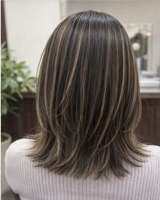 • 表面のレイヤー: 表面に独立したレイヤーを入れることで、手ぐしを通すだけでハイライトの筋感が際立ち、軽やかな動きが出ます。